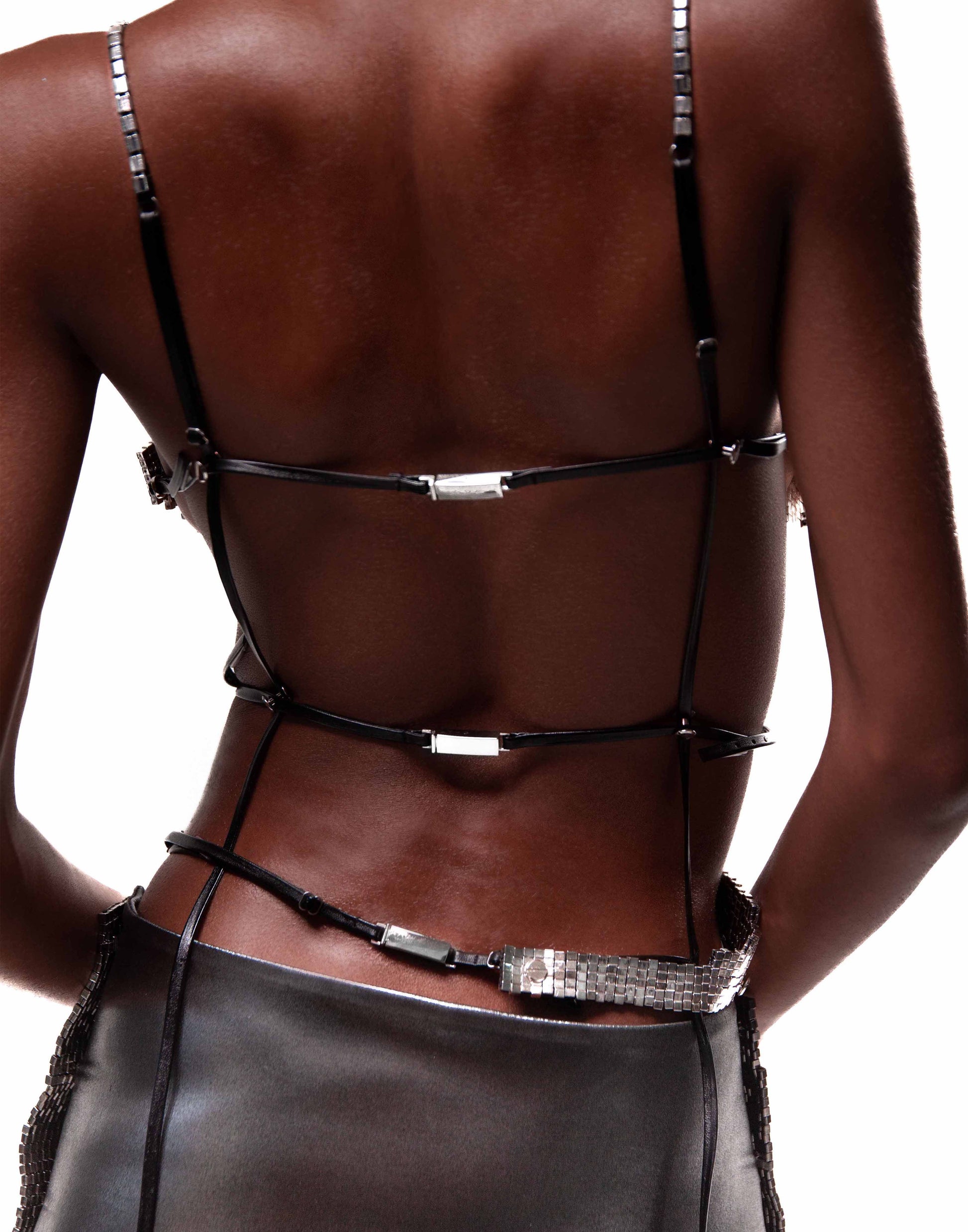 - The metallic beaded backless top redefines the typical tank top through contrast of revealing and concealing with entirely hand-crafted beaded panels in the front and straps on an open back.